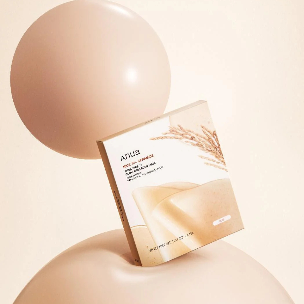 Anua Rice 70 Glow Collagen Mask er en hydrogelmaske designet for å gi dyp fuktighet og en strålende glød til huden. Den inneholder 70 % risvann og lavmolekylært kollagen (300 Da), som smelter ved hudens temperatur for å gi en jevn og fast hud med en glassaktig finish.