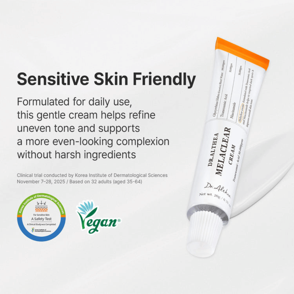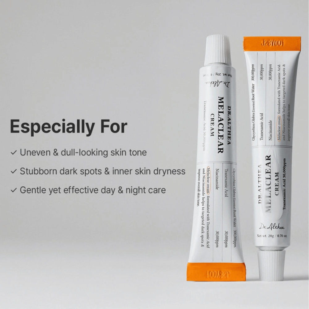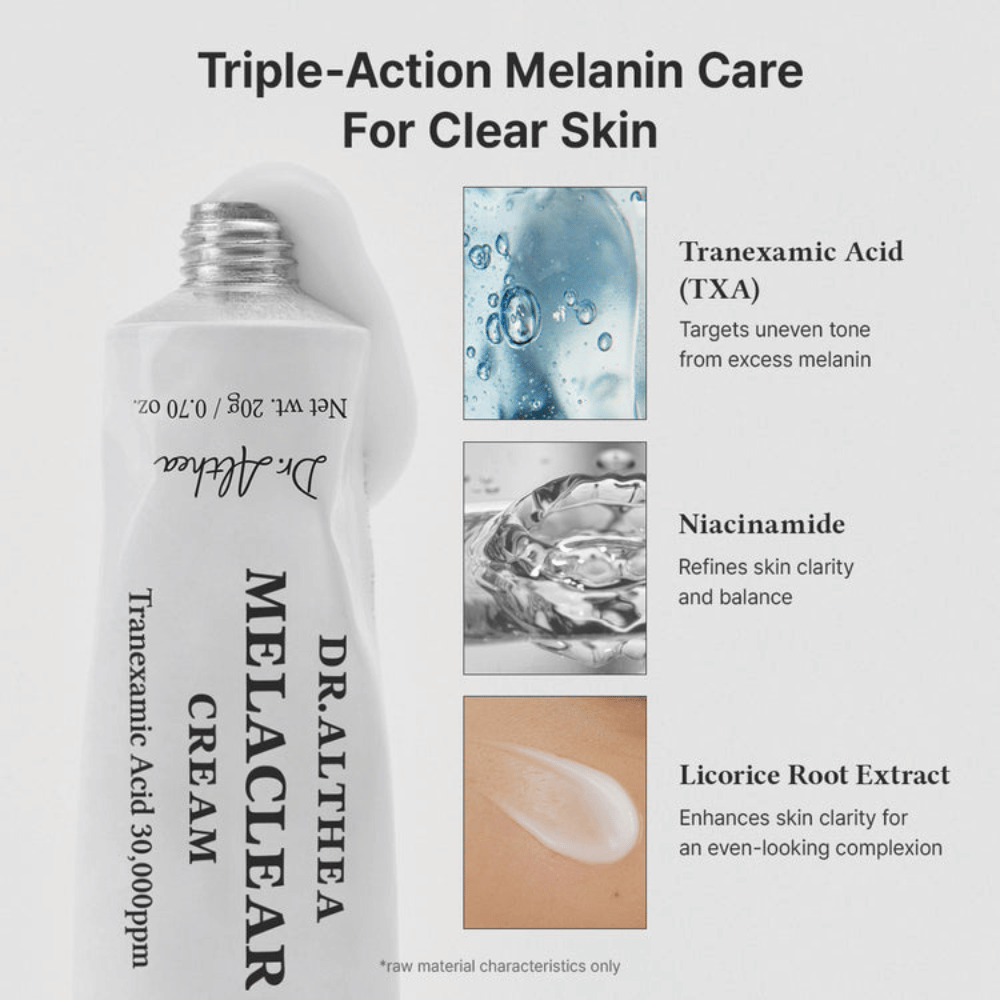 Dr. Althea Melaclear Cream er en fuktighetsgivende ansiktskrem utviklet for hud med pigmentflekker, ujevn hudtone og gusten hud. Kremen kombinerer flere aktive ingredienser som bidrar til å forbedre hudens klarhet og gi en mer balansert hudtone over tid.