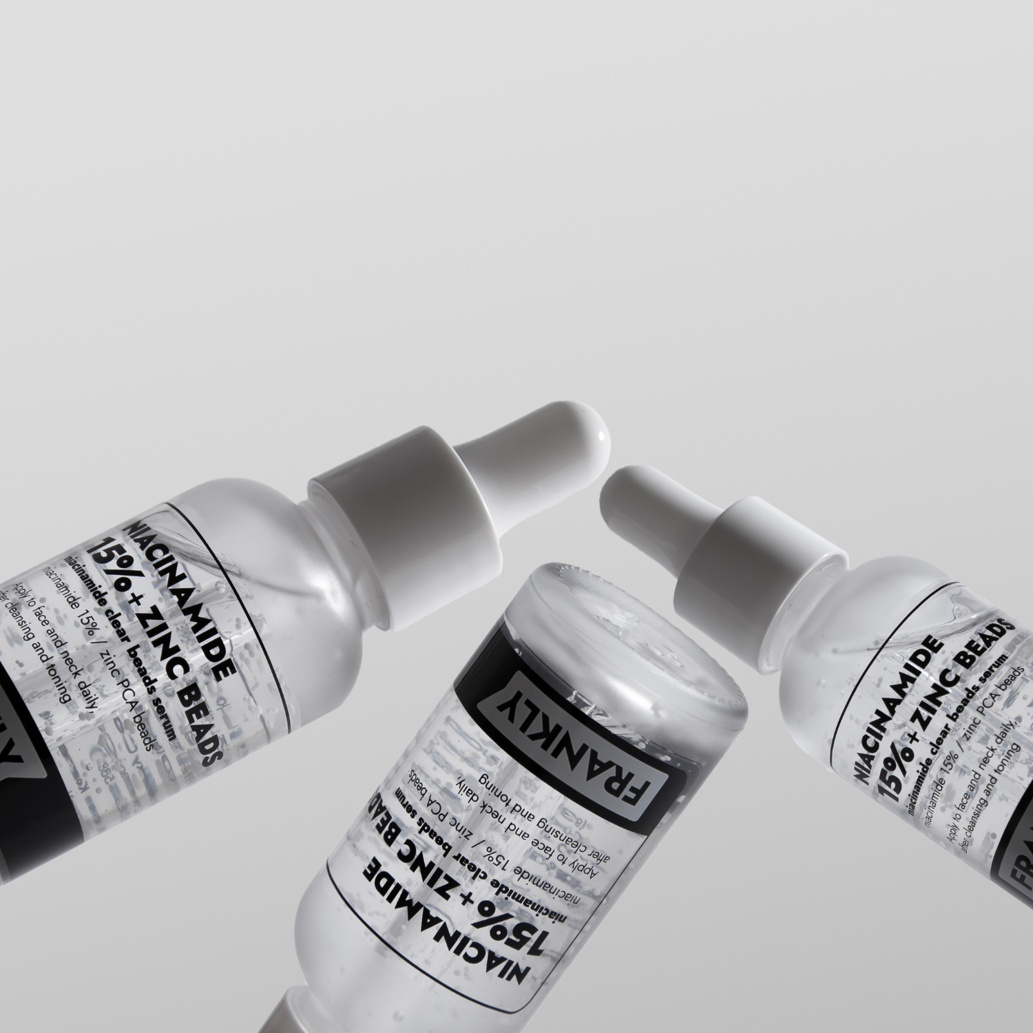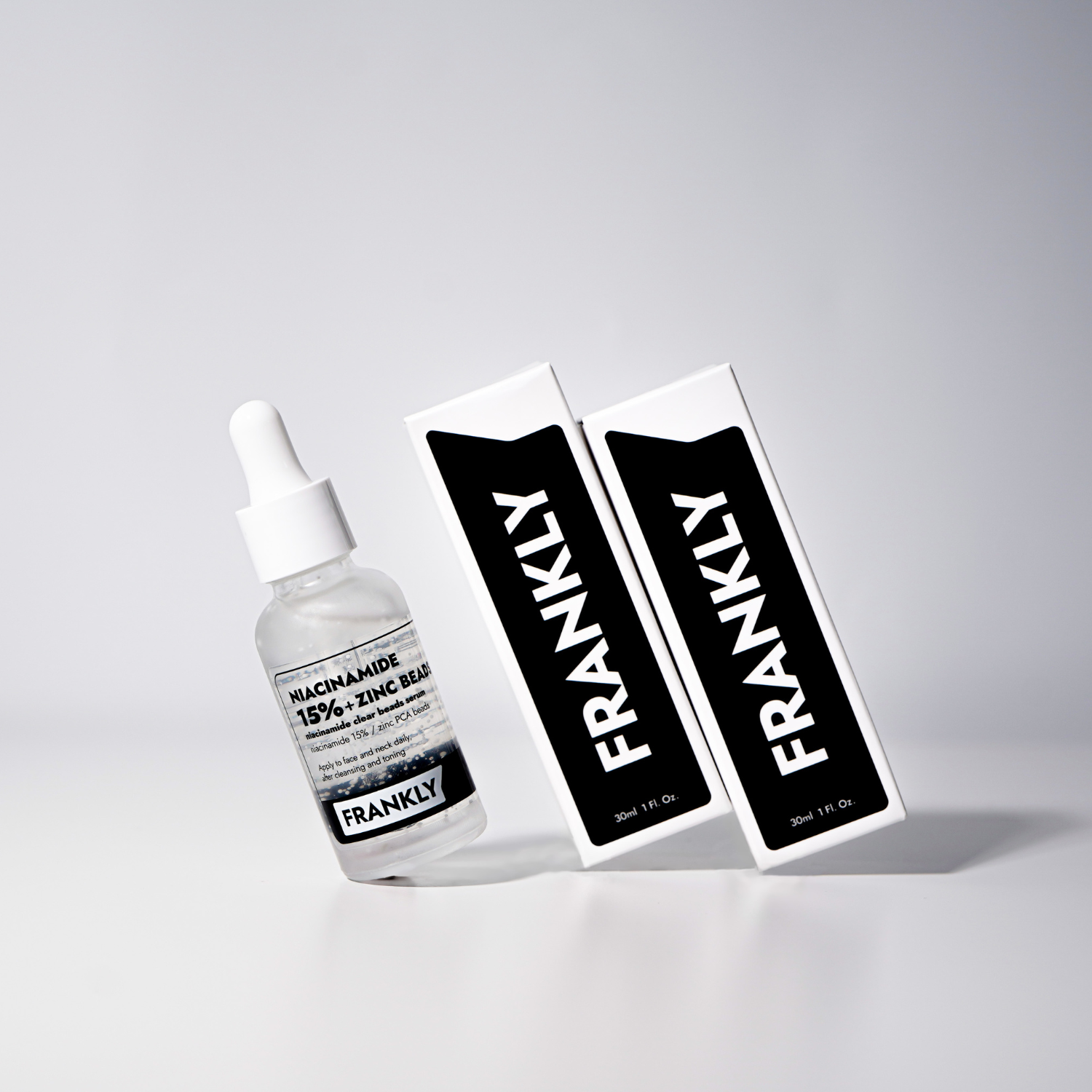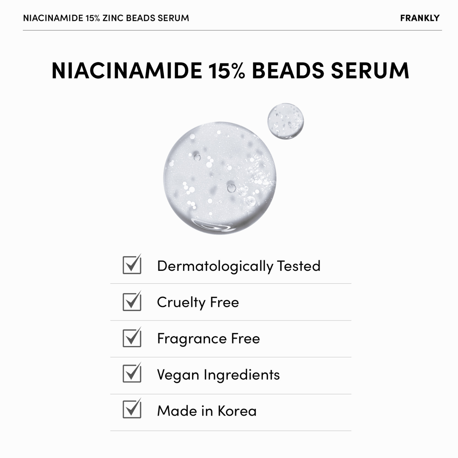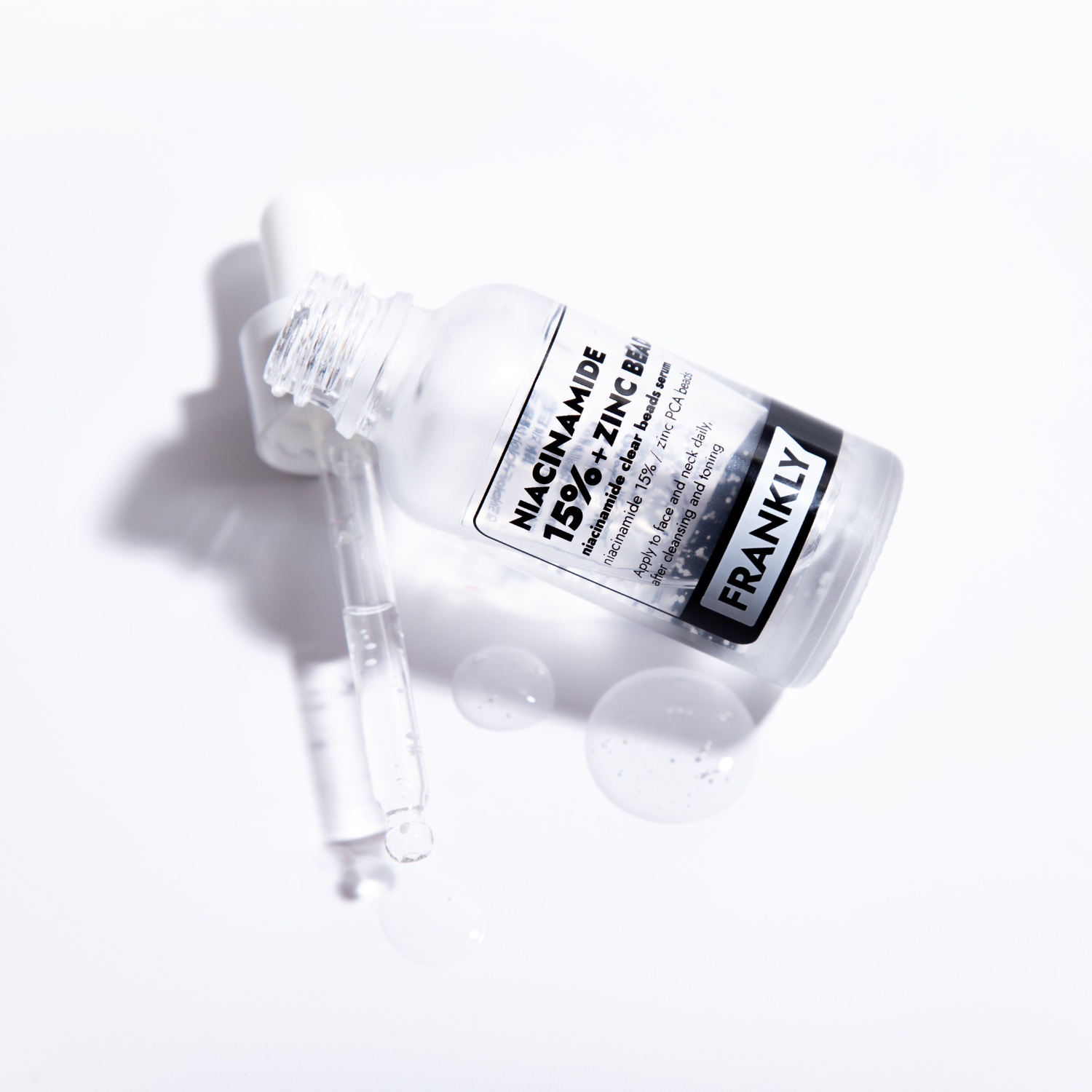 Frankly Niacinamide 15% Zinc Beads Serum er et aktivt serum utviklet for å balansere talgproduksjon, redusere urenheter og forbedre hudens klarhet. Med en høy konsentrasjon av 15 % niacinamid jobber produktet målrettet med å jevne ut hudtone, redusere synligheten av porer og styrke hudens barriere.