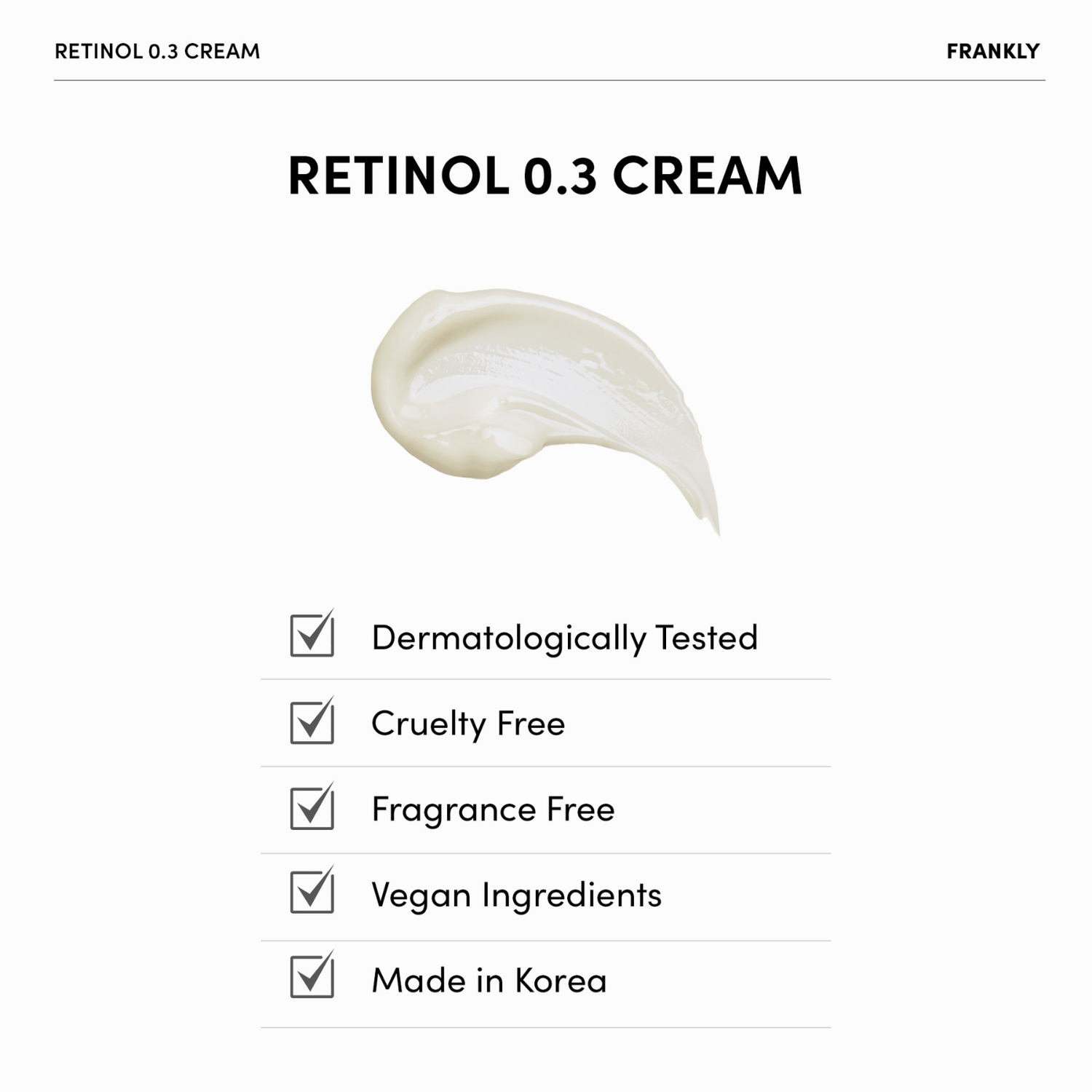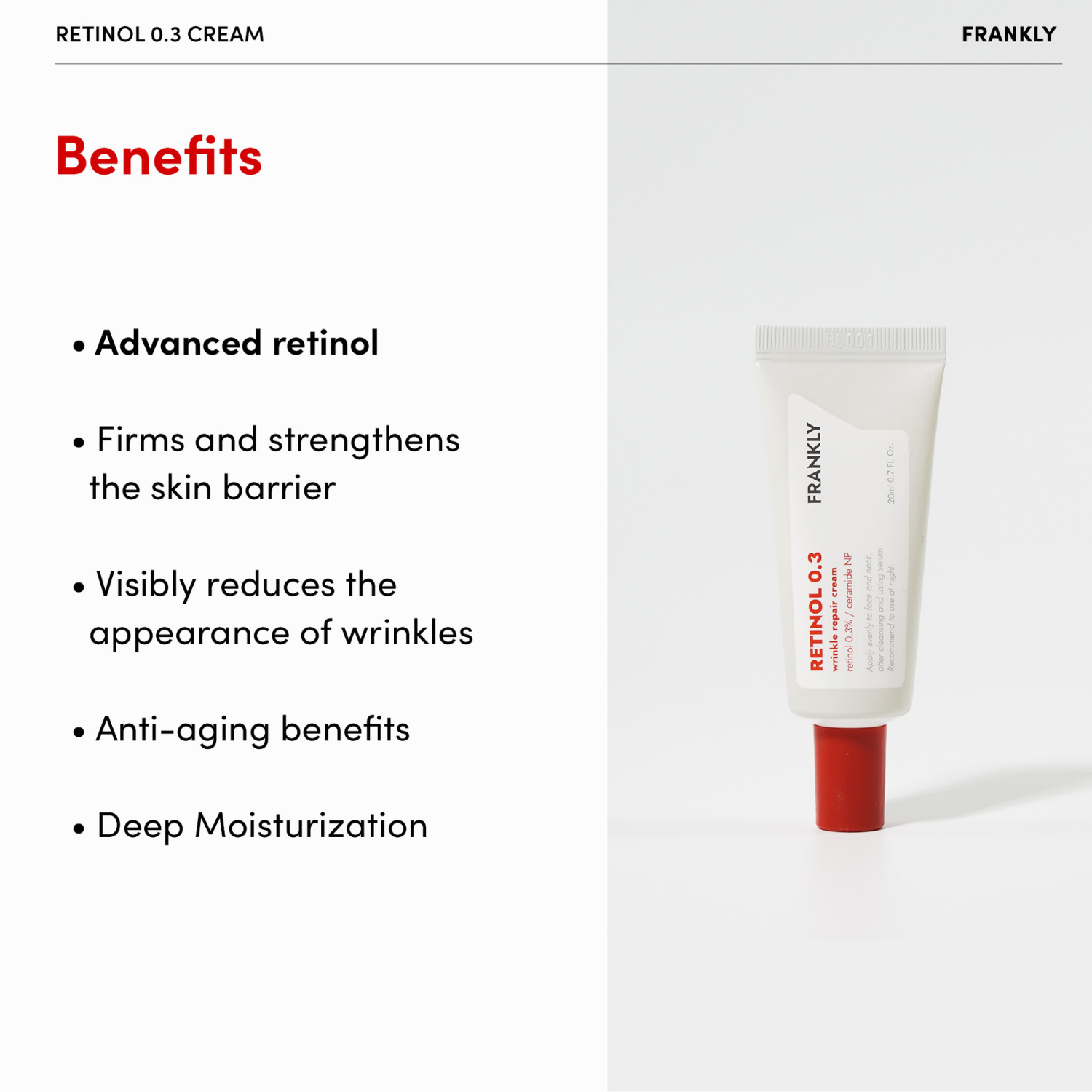 Frankly Retinol 0.3 Cream er en aktiv retinolbehandling utviklet for å forbedre hudens struktur, redusere fine linjer og gi en jevnere hudtone. Produktet inneholder 0,3 % ren retinol, en effektiv ingrediens kjent for å støtte cellefornyelse og stimulere kollagenproduksjon, noe som bidrar til fastere og glattere hud.