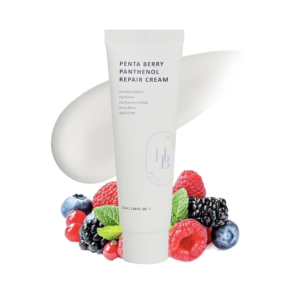 Heveblue Penta Berry Panthenol Repair Cream er en lett og nærende krem laget for å berolige og reparere sensitiv, tørr og stresset hud. Den unike PentaBerry-komplekset med fem ulike bærekstrakter (bl.a. blåbær, bringebær og tranebær) kombineres med rikelig panthenol (100 000 ppm) og Centella Asiatica-leaf water (691 684 ppm), som sammen styrker hudbarrieren og gir dyp, balansert fuktighet. I tillegg inneholder Houttuynia cordata og Sweetone® for ekstra antioksidantbeskyttelse. Kremen absorberes raskt med en vannlig følelse som ikke etterlater klebrighet.