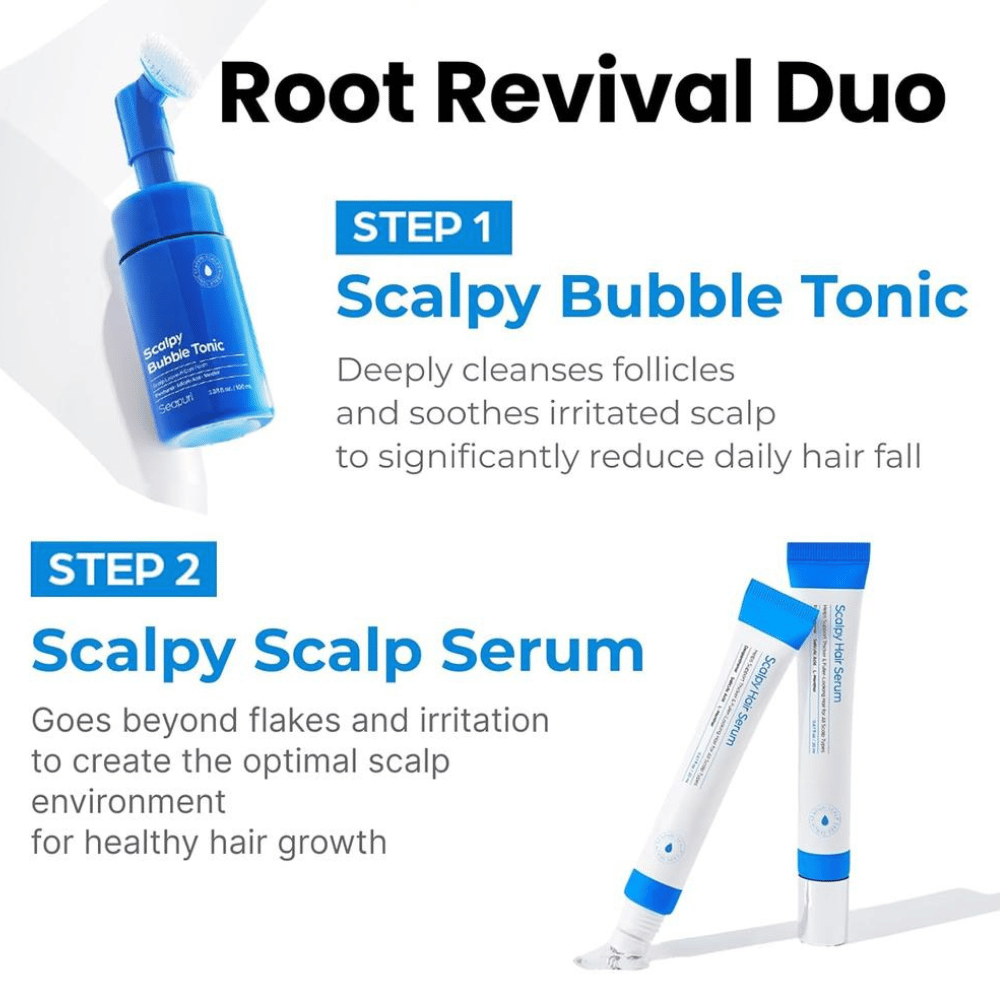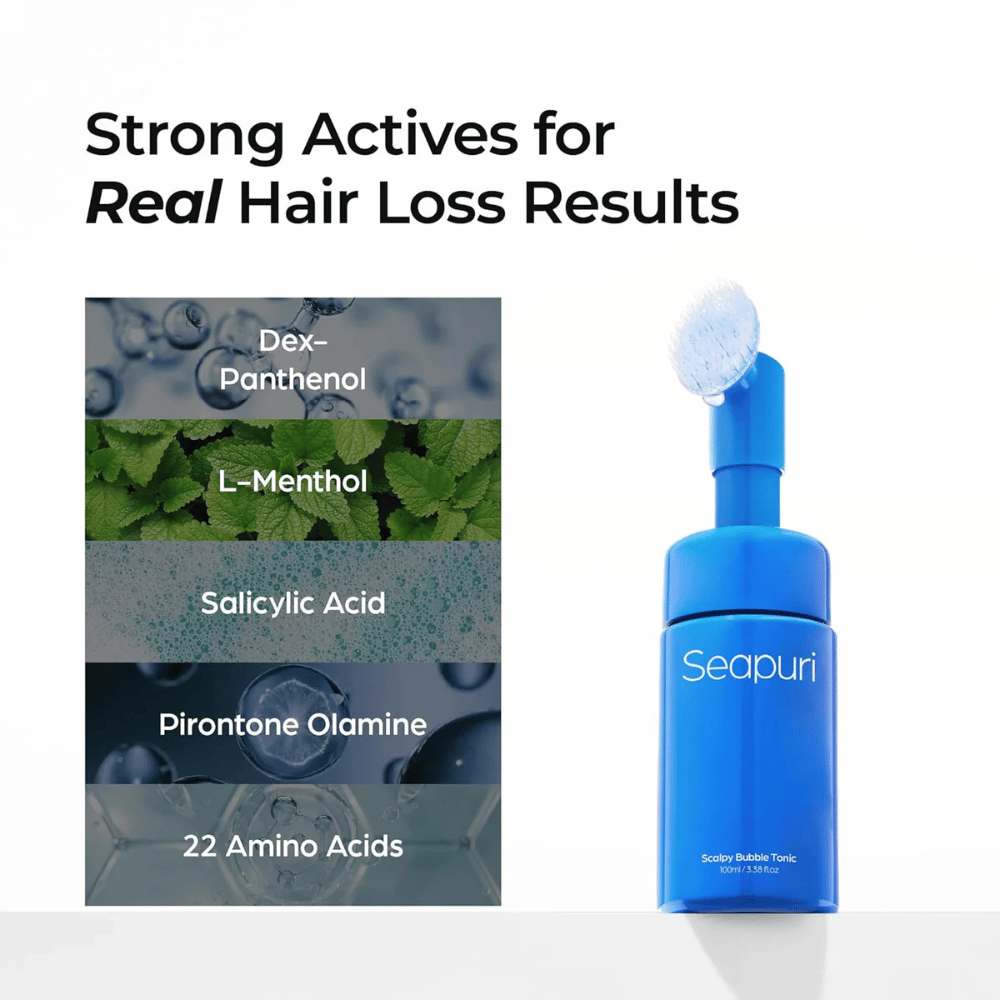 Seapuri Scalpy Bubble Tonic er en unik hår- og hodebunnstonic med skummende formel som kombinerer mild eksfoliering, hodebunnspleie og næring til hårsekkene. Tonicen er utviklet for å rense hodebunnen grundig — den fjerner overflødig talg, døde hudceller og opphopning, samtidig som den roer og styrker hodebunnen. Med ingredienser som salisylsyre, mentol og dekspanthenol bidrar tonic til å løsne tette porer i hodebunnen, redusere flass og irritasjon, og legge grunnlaget for sterkere, sunnere hårvekst. Den praktiske flasken med integrert børste gjør det enkelt å massere skummet ned til røttene for en grundig, krypende rens. Etter bruk føles hodebunnen frisk, kjølt og balansert — og håret får bedre grobunn.