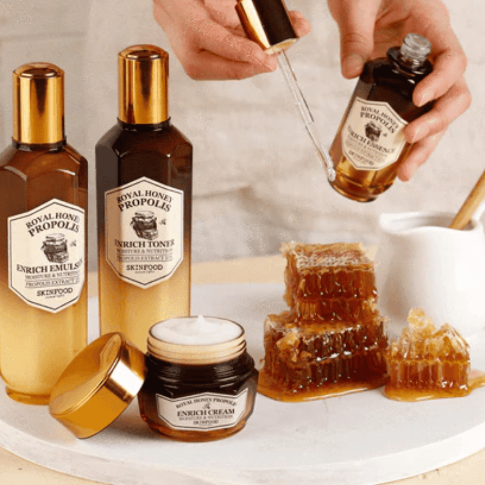 Oppdag hemmeligheten til en mer næret og smidig hud med SKINFOOD’s Royal Honey Propolis Enrich Essence. Denne essensen er sammensatt av naturlige ingredienser med hele 63% biepropolis ekstrakt, 10% ekte kongelig gelé og 10% honningekstrakt. Disse ingrediensene er nøye valgt for å styrke huden og gi den økt elastisitet og glatthet.