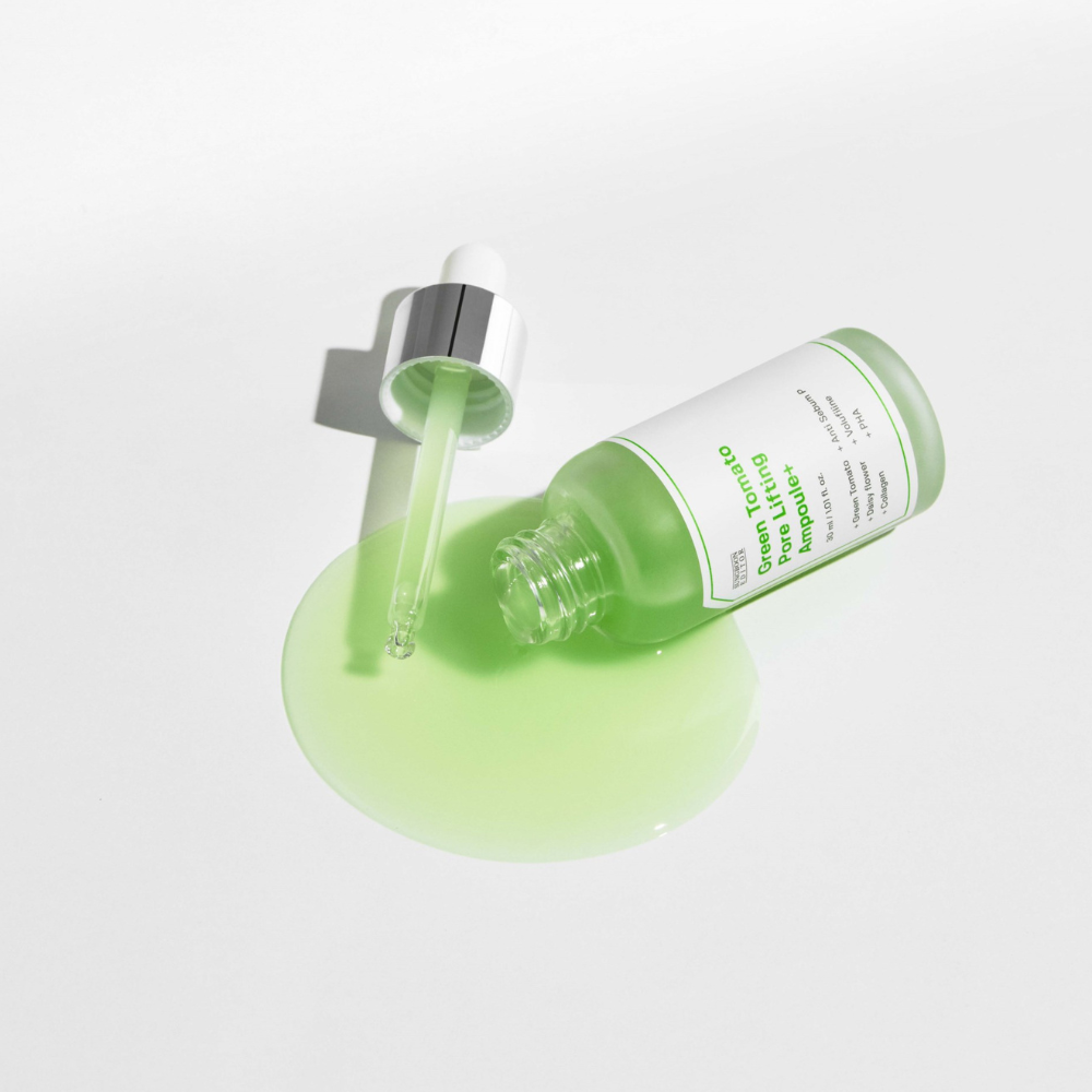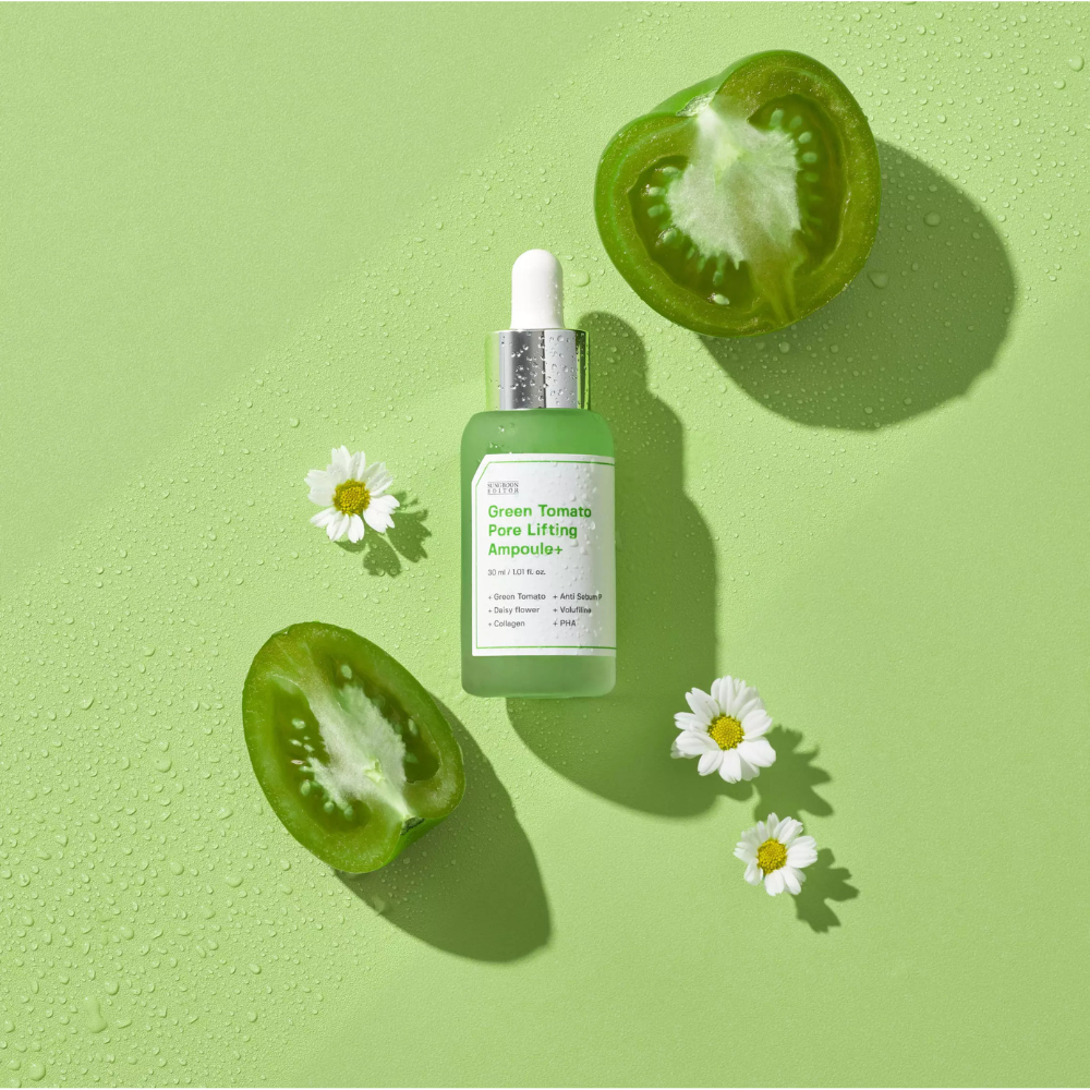 Sungboon Editor Green Tomato Pore Lifting Ampoule+ – et lett serum ampulle med grønn tomat ekstrakt, niacinamid og PHA som minimerer porer, løfter, reduserer overskuddstalg og gir klarere hud uten å irritere.