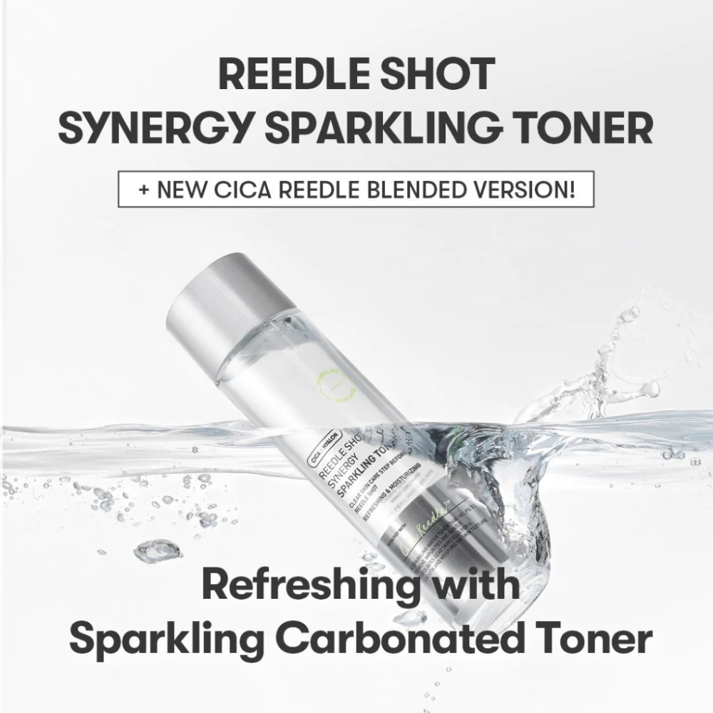 VT Cosmetics Reedle Shot Synergy Sparkling Toner er en oppfriskende toner med mikrobobler fra rent, italiensk karbonvann som hjelper til med å rense porene og fjerne urenheter. Den lette, kjølende teksturen absorberes raskt uten å etterlate en klissete følelse, og gir huden en frisk, ren og balansert finish.